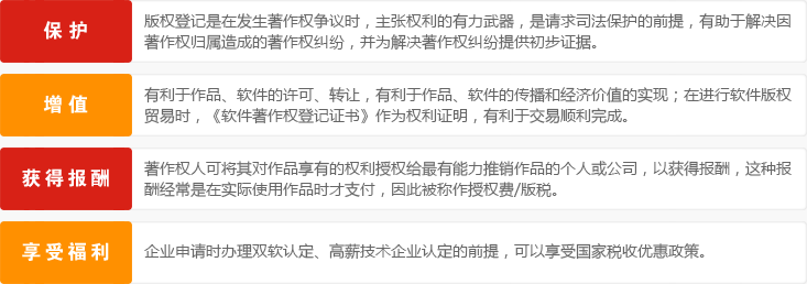 國家著作權(quán)行政管理部門鼓勵(lì)著作權(quán)人進(jìn)行計(jì)算機(jī)軟件著作權(quán)登記,并對已登記的軟件給予重點(diǎn)保護(hù)。軟件著作權(quán)登記證書是對登記事項(xiàng)的初步證明,可以幫助持有者在訴訟中祈禱減輕舉證責(zé)任的作用。根據(jù)國務(wù)院頒發(fā)的《鼓勵(lì)軟件產(chǎn)業(yè)和集成電路產(chǎn)業(yè)發(fā)展的若干政策》的有關(guān)規(guī)定,證書可以作為軟件企業(yè)減免稅收的證明。